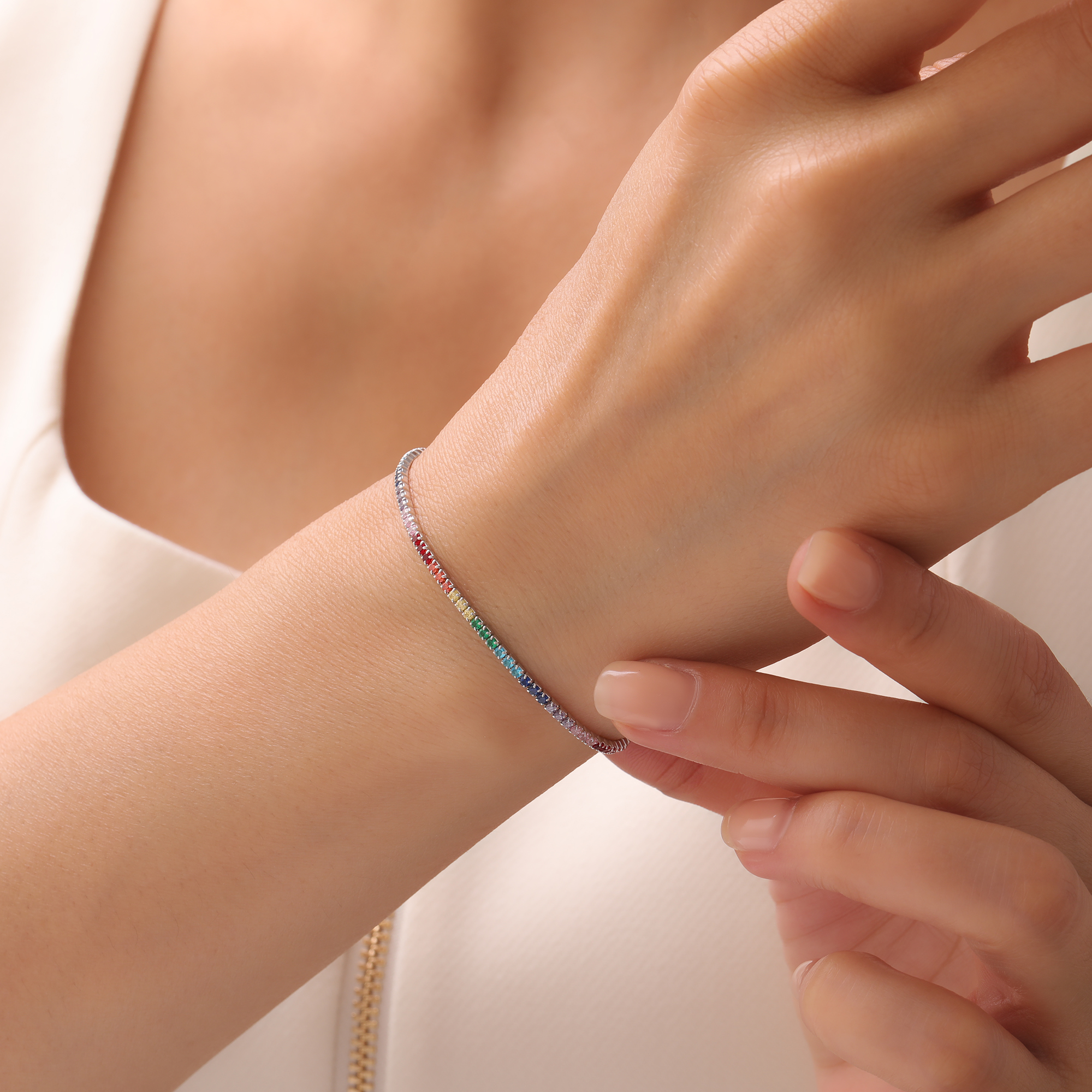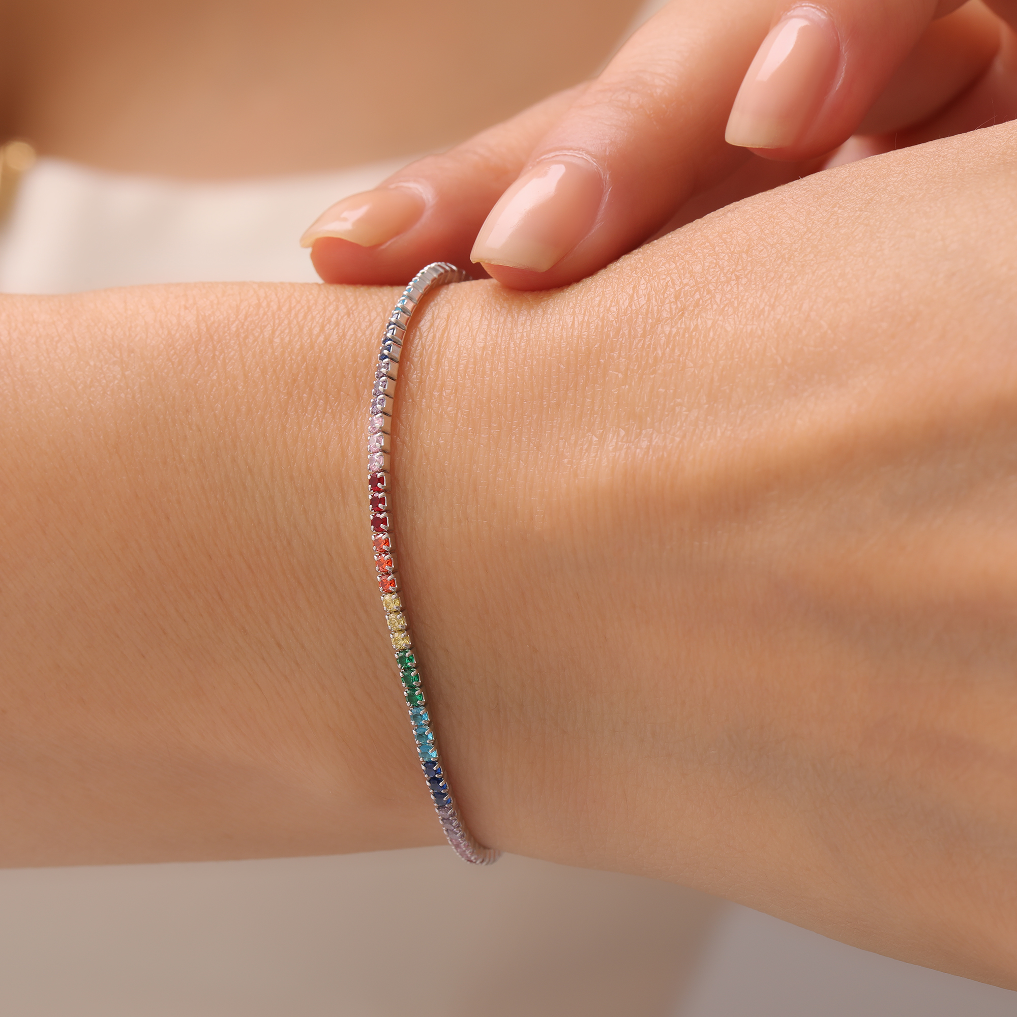 Bu şık su yolu bileklik, modern tasarımı ve zarif detaylarıyla göz kamaştırıyor. Renkli zirkon taşların stratejik yerleşimi, bileziğin her hareketinizde ışıldamasını sağlarken, gümüşün doğal parlaklığı da ona eşlik ediyor. Rodyum kaplama, gümüşün oksitlenmesini önleyerek ürünün daima yeni gibi görünmesini garantiliyor.