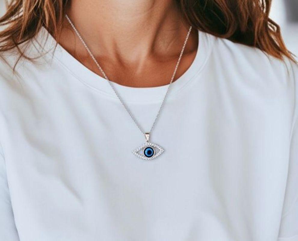 Özel tasarımı ve zarif detayları ile dikkat çeken 925 Ayar Gümüş Zirkon Taşlı Rodyumlu Nazar Göz Kolye, hem günlük hem de özel günlerde kullanıma uygun şık bir aksesuardır. Bu kolye, hem estetik hem de sembolik anlamı ile tüm kadınların beğenisini kazanacak bir parça olarak öne çıkmaktadır.