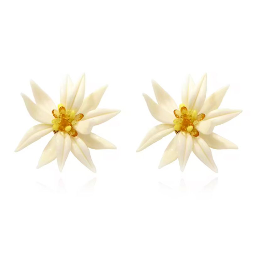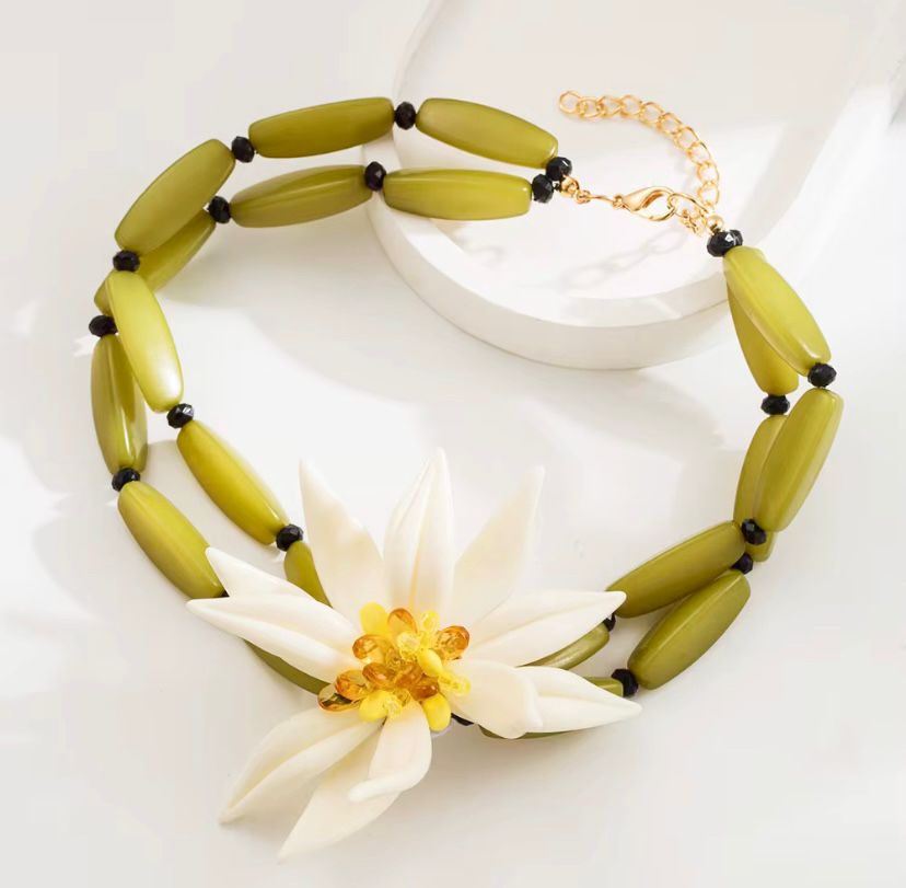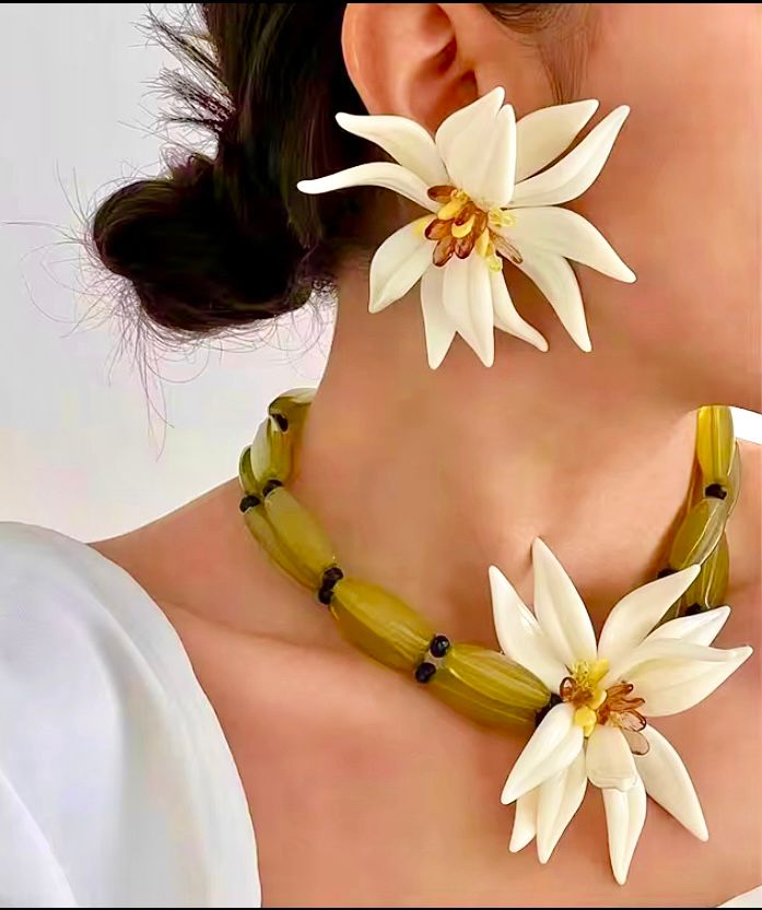 Akrilik Yeşil&Kemik Renk Çiçek Model Kolye ve Küpe