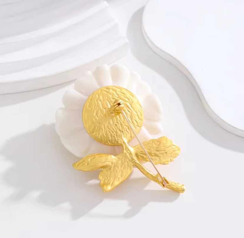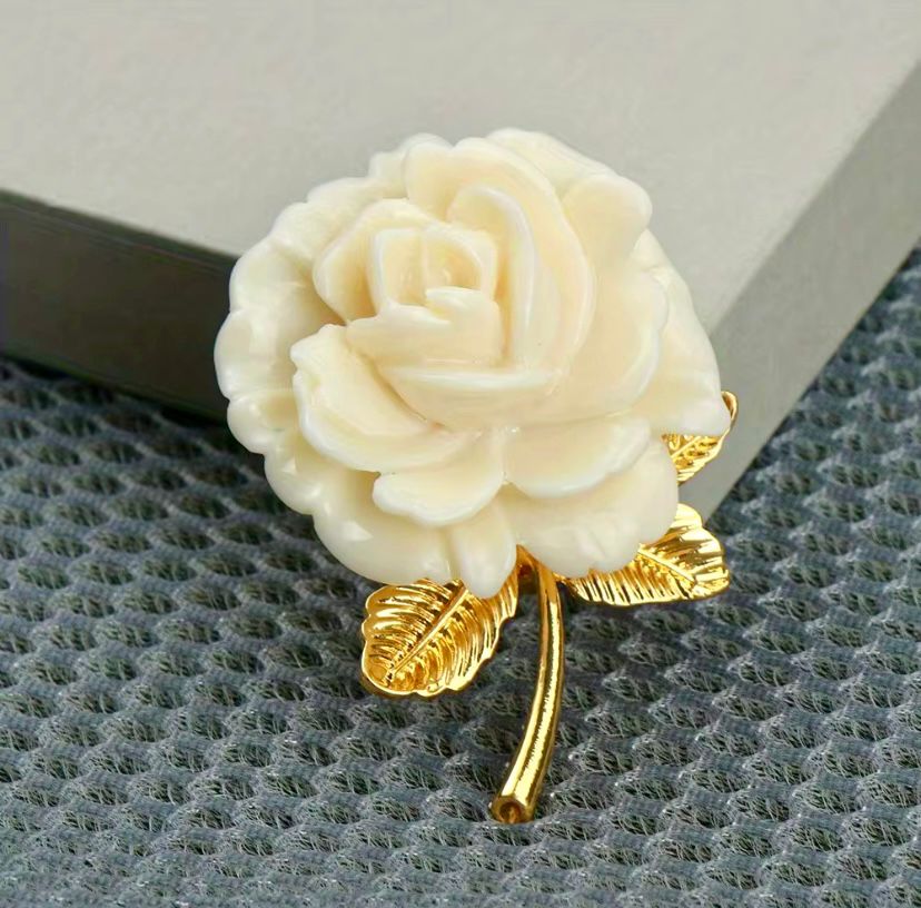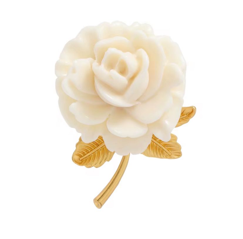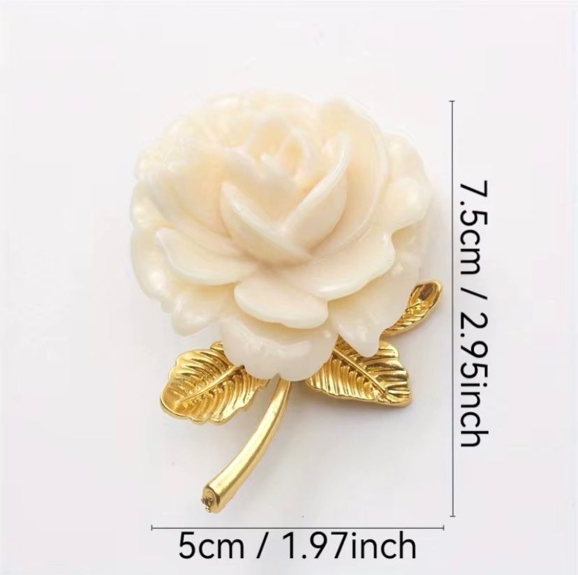 Bu broş, zarif bir gül çiçeği formunda tasarlanmıştır. Altın rengi, şıklığını ve zarafetini ön plana çıkarırken, beyaz çiçek detayları ise ürüne taze ve canlı bir görünüm kazandırır. Göz alıcı yapısı sayesinde özel toplantılarda, düğünlerde ya da günlük hayatta şıklığınızı tamamlayabilirsiniz.