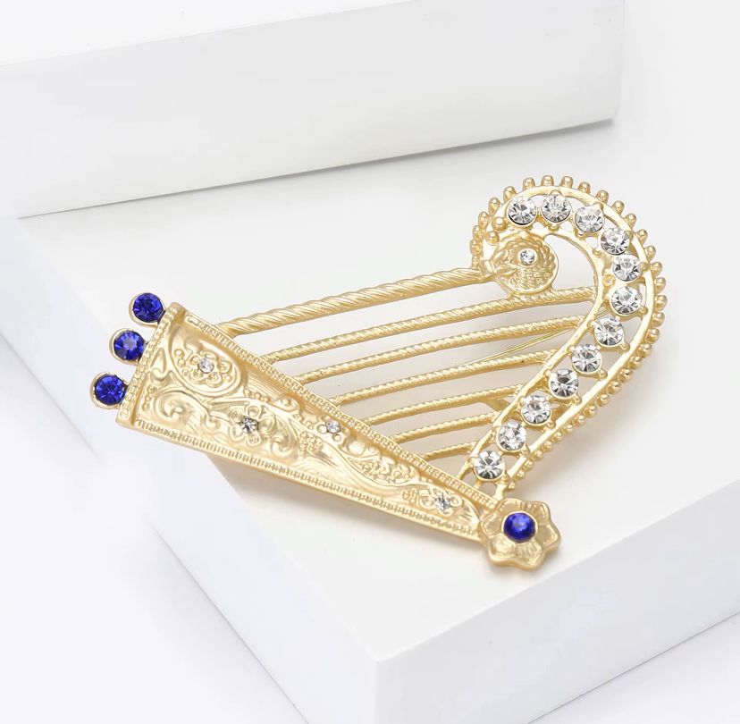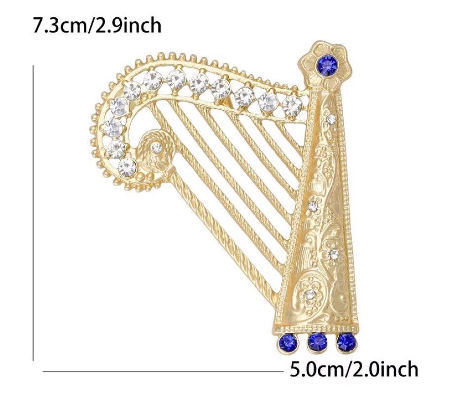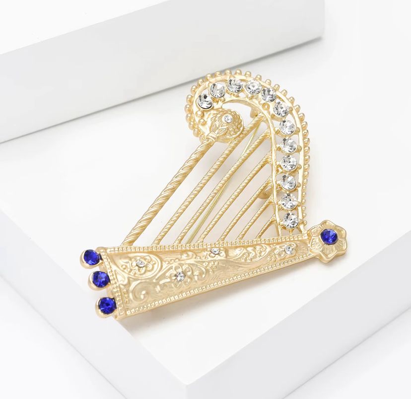 Broş, özenle işlenmiş altın rengi metalden üretilmiştir. Her bir ayrıntısı titizlikle düşünülmüş, müzik arpı formu, zarif çizgileri ve modern dokunuşlarıyla dikkat çekmektedir. Zirkon taşları, broşun üzerine yerleştirilmiş ve ışıltılarıyla mükemmel bir efekt yaratmıştır. Bu taşlar, gün ışığında parlayarak, simgelediği melodinin ve hayal gücünün bir yansıması gibidir.