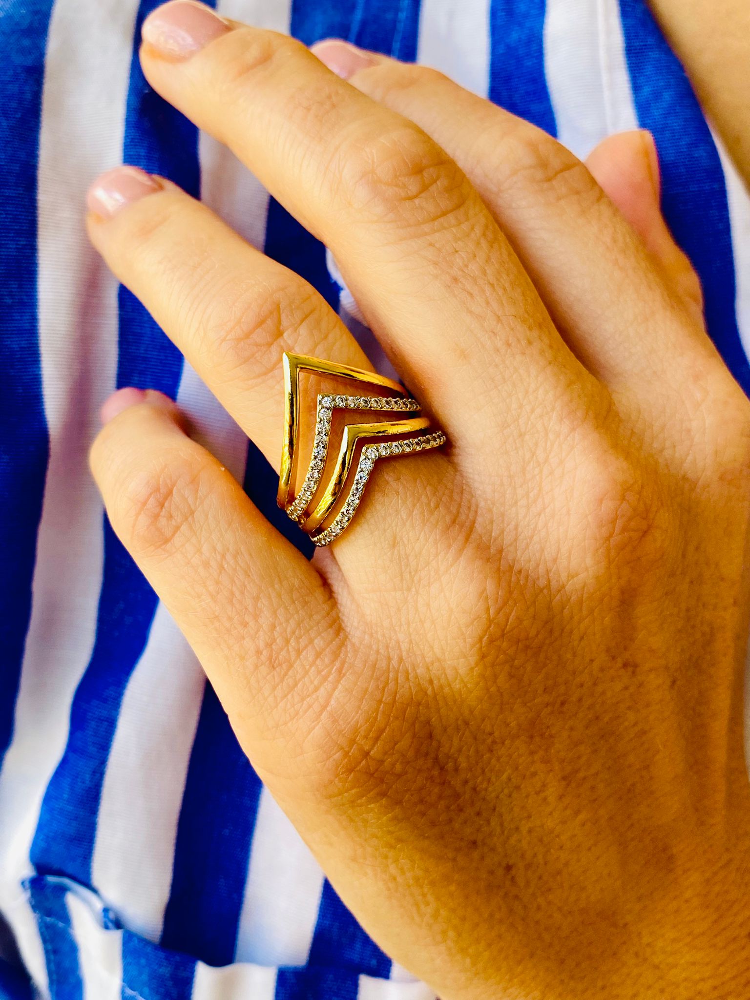 Yüzüğün V modeli, modern ve çağdaş bir görünüm sunarak, sahip olduğu zarif hatlarla parmaklarınızı süsler. Klasik formlardan uzak, dinamik ve özgün bir hava yaratan bu tasarım, her ortamda dikkatleri üzerine çekmeyi başarıyor. Yüzüğün altın rengi, sıcak bir ışıltı ile zenginleştirilmiş olup, herhangi bir kıyafetle kolayca uyum sağlar.