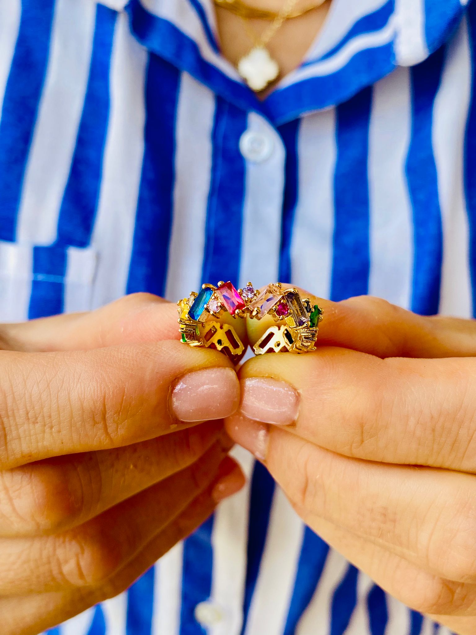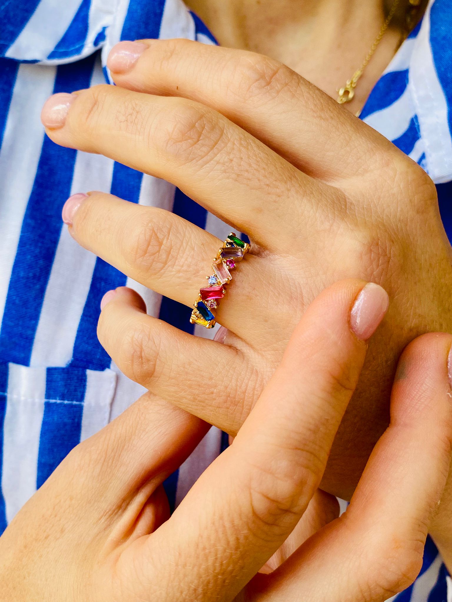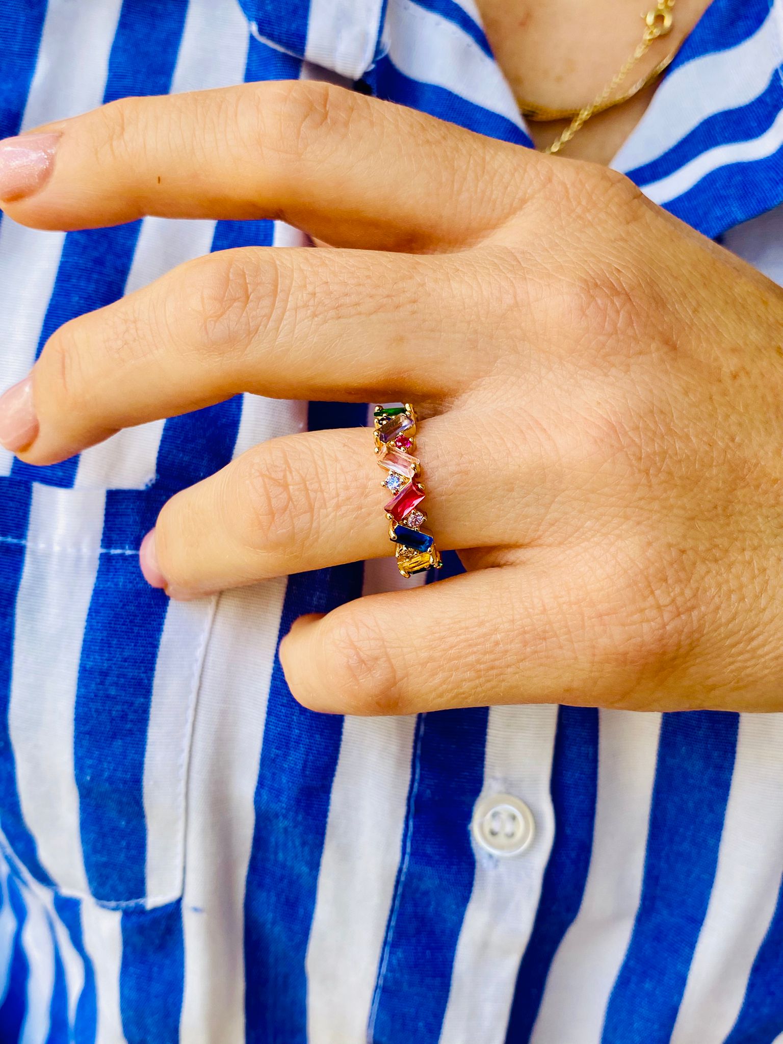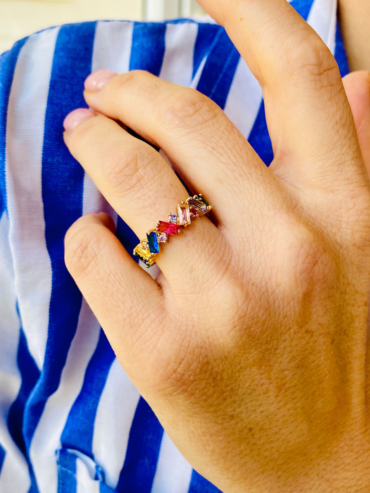 Şıklığı, zarafeti ve renkleri bir arada sunan Baget Kesim Renkli Zirkon Taşlı Rainbow Ayarlanabilir Tamtur Yüzük, her anınızı özel kılmak için tasarlandı. Bu eşsiz yüzük, modern tasarımı ve göz alıcı detaylarıyla dikkatleri üzerine çekiyor.
