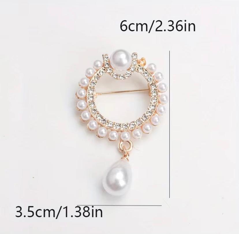 İncili Zirkon Taşlı Altın Renk Broş, 5 cm x 4 cm ebatlarıyla dikkat çekici bir görünüme sahiptir. Hafif yapısı sayesinde rahat bir kullanım sunar, böylece uzun süre takıldığında bile rahatsızlık hissi oluşturmaz.