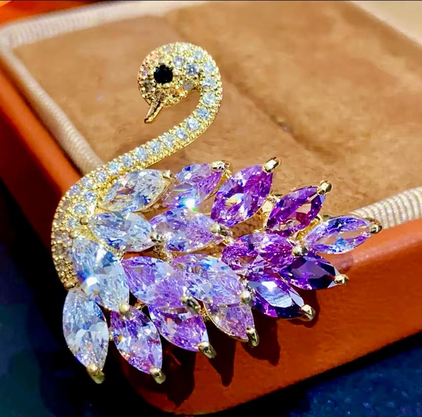 Mor Zirkon Taşlı Altın Renk Kuğu Broş