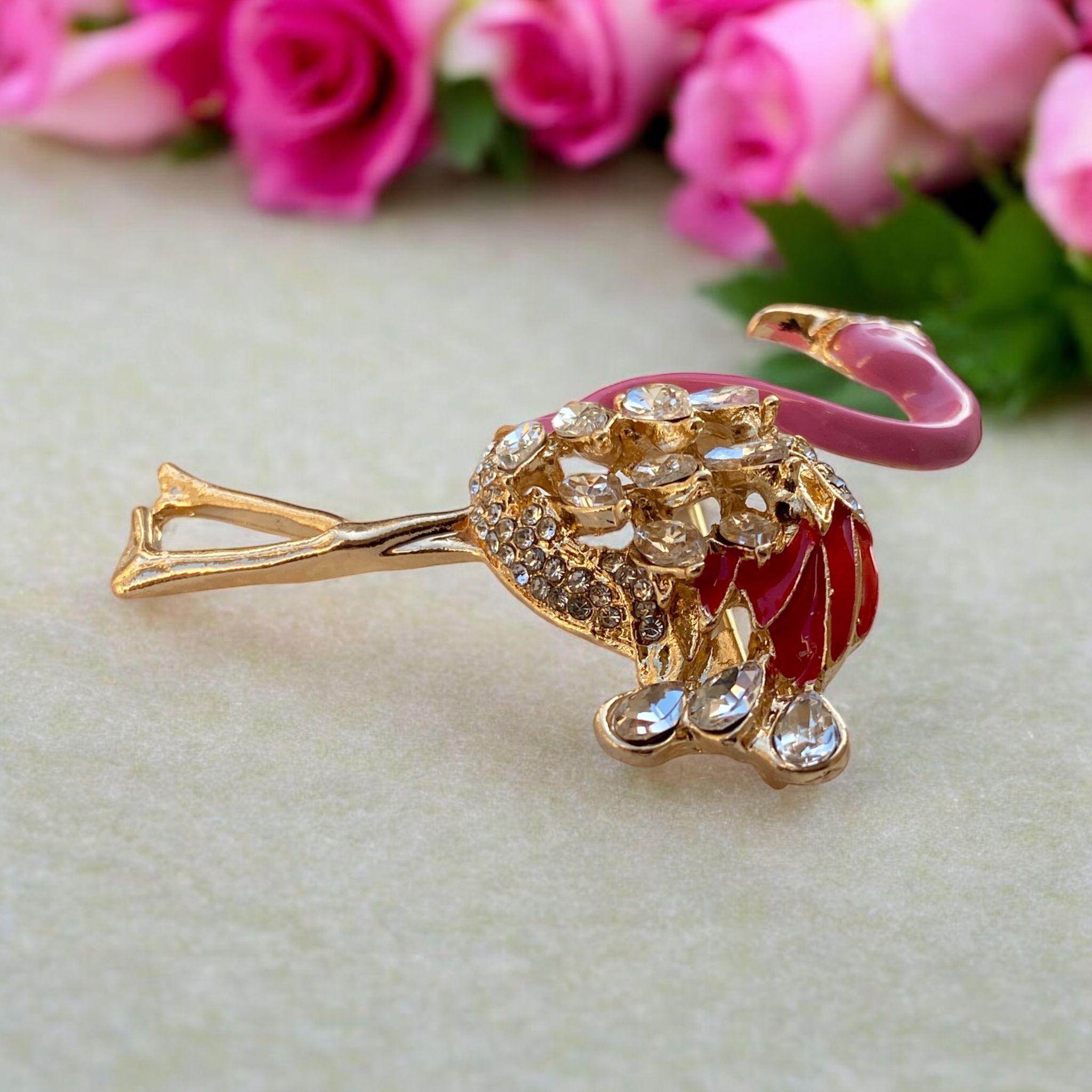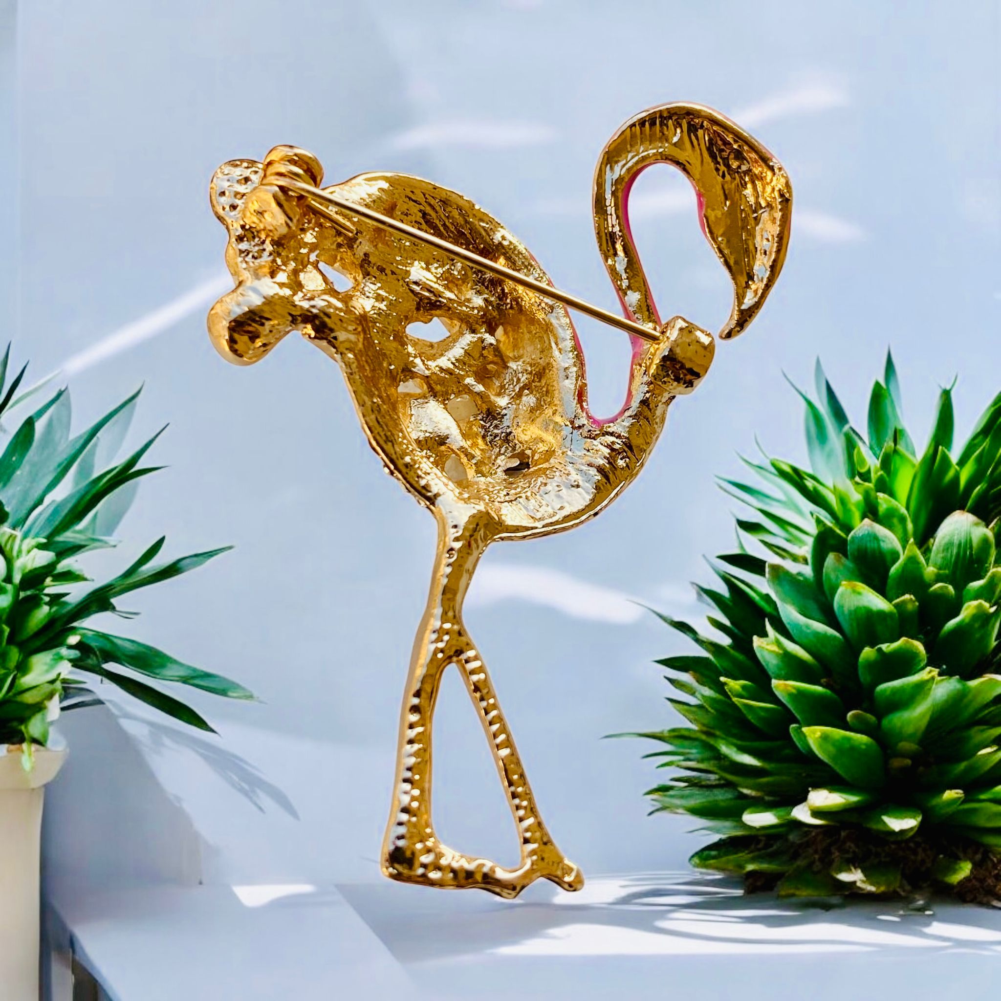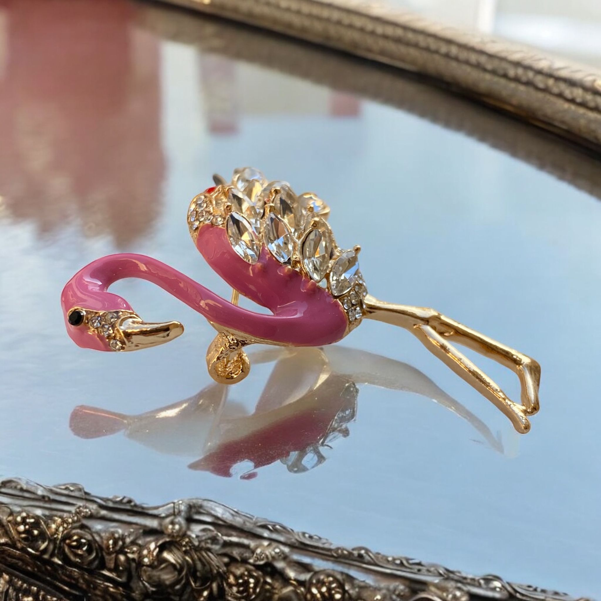 Bu broş, zarif hatları ve dikkatlice işlenmiş detayları ile göz alıcı bir tasarıma sahiptir. Flamingo figürü, pembenin yumuşak tonlarıyla birlikte mineli uygulama ile bezenmiştir. Mineli yüzey, akışkan bir görünüm sunarken, altın renkli metal ile birleşerek lüks bir atmosfer yaratır. Broşun gövdesinde yer alan zirkon taşlar, ışığın altında parlayarak gün ışığında bile etkileyici bir ışıltı sağlar.