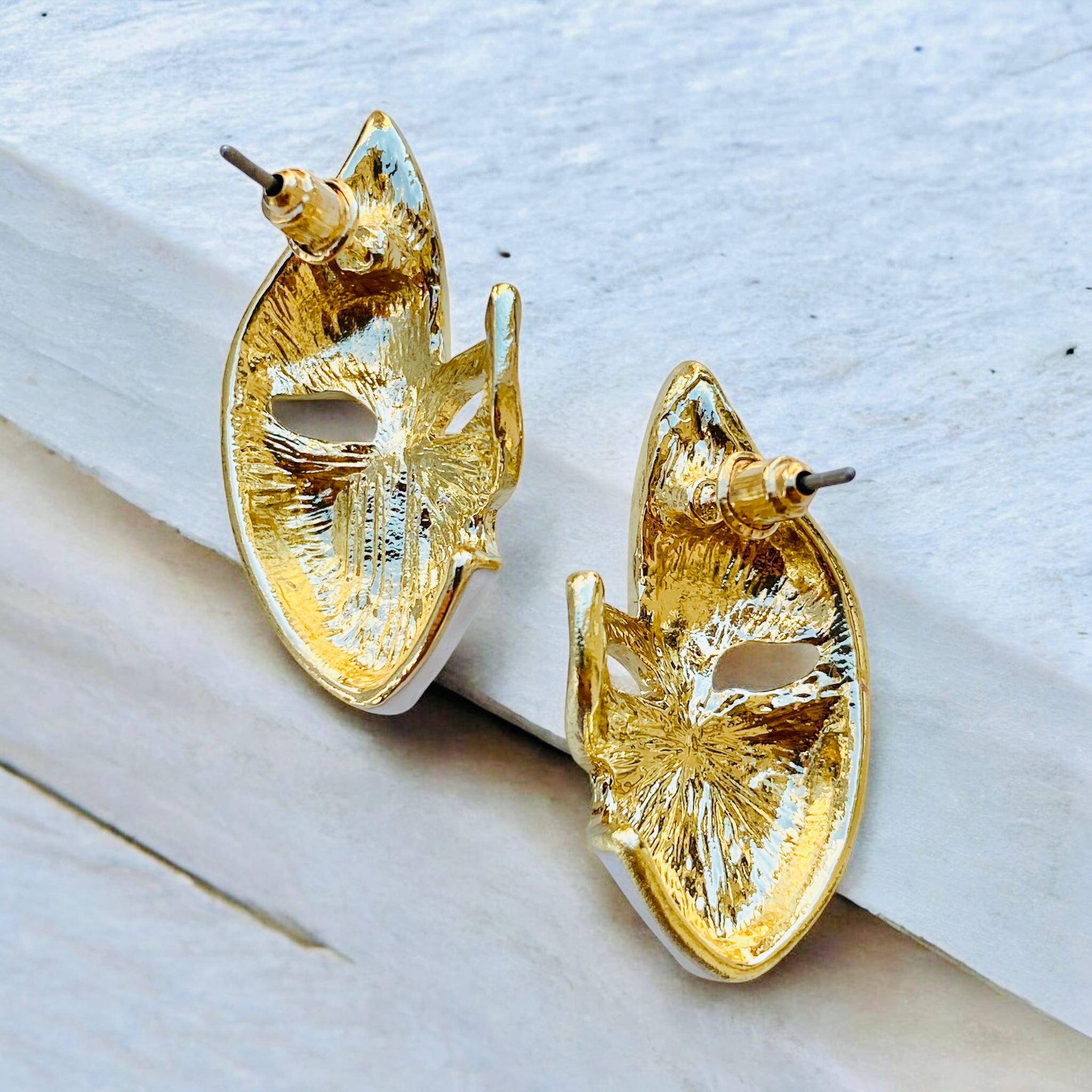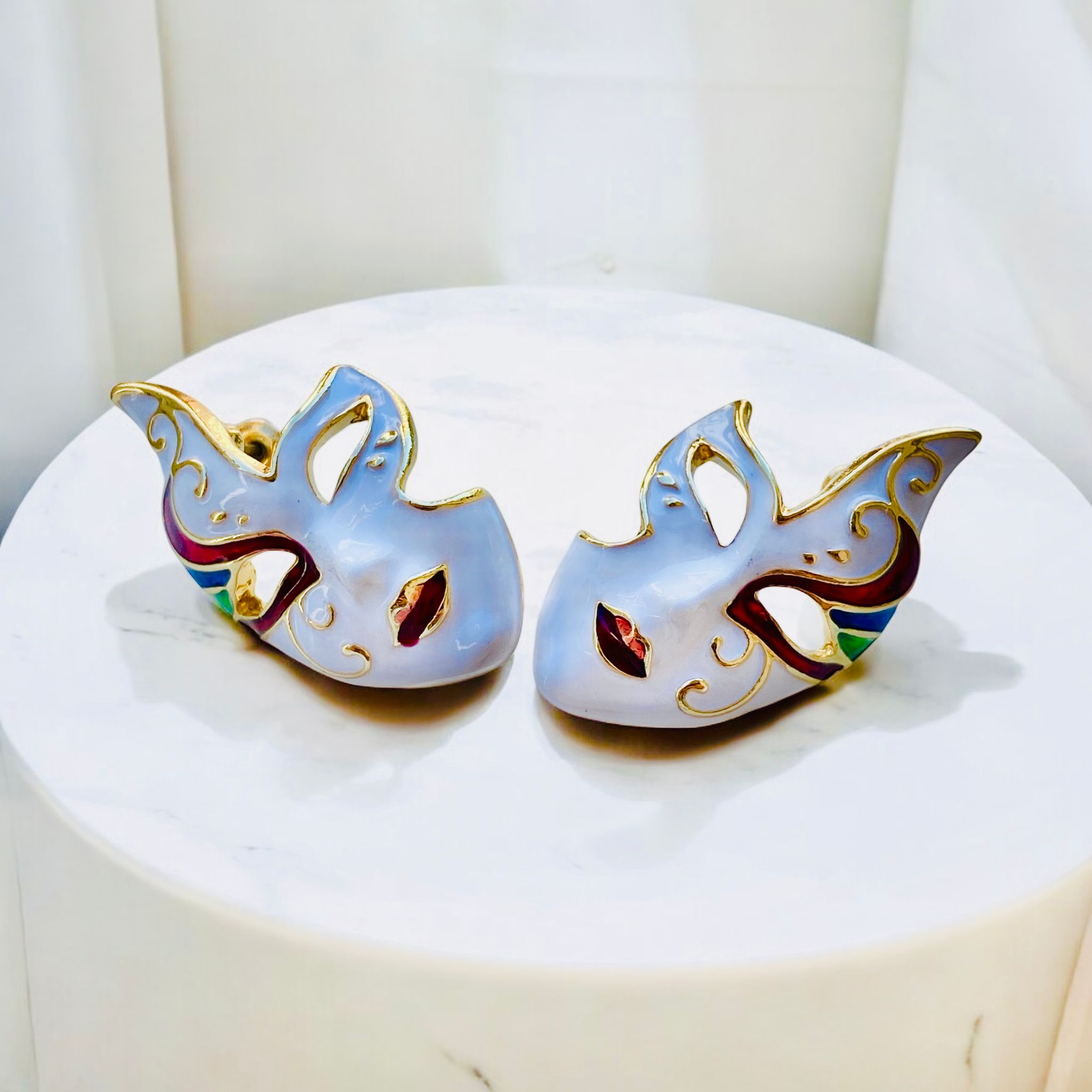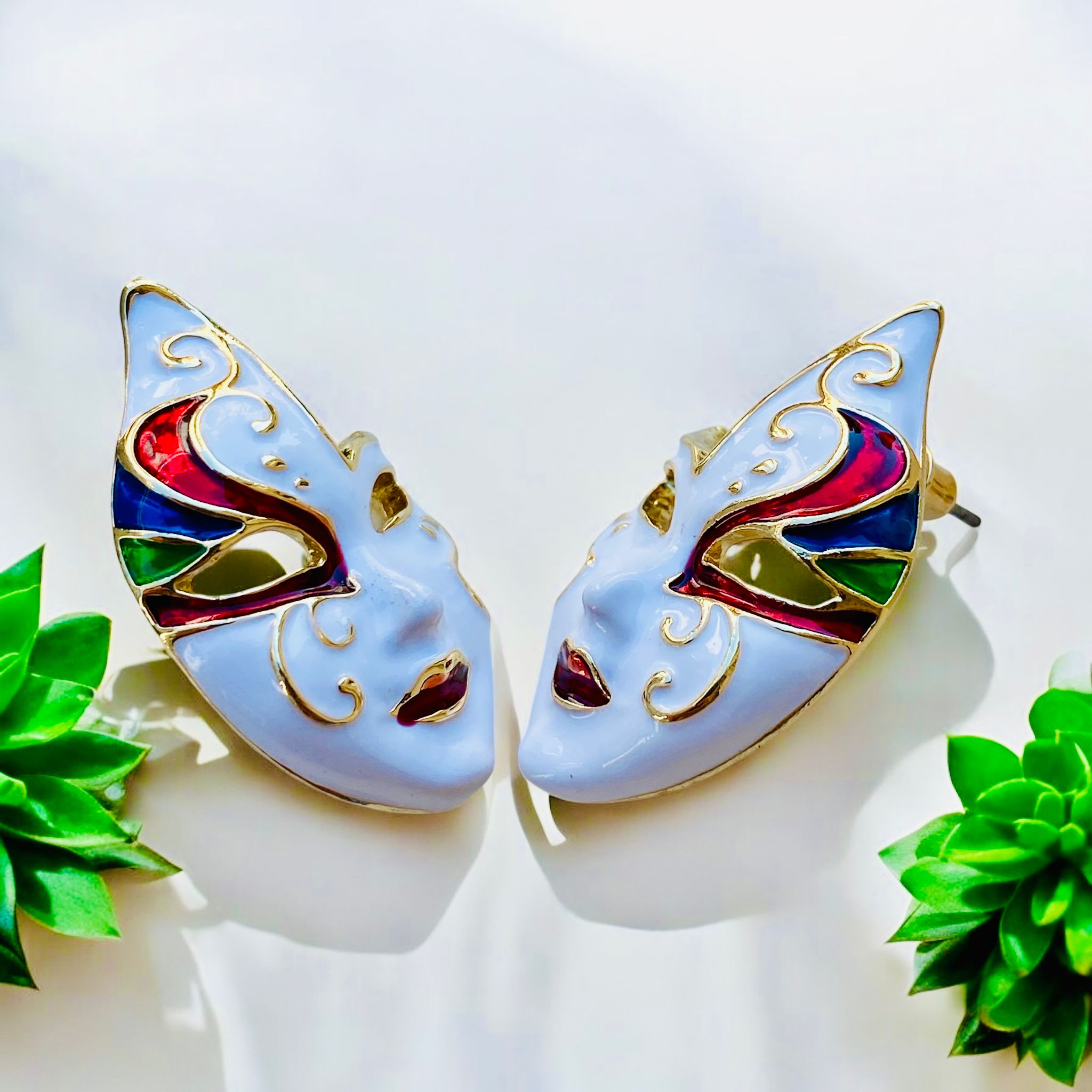 Renkli Mineli Altın Renk Çivi Kilitli Tiyatro Maskesi Küpe