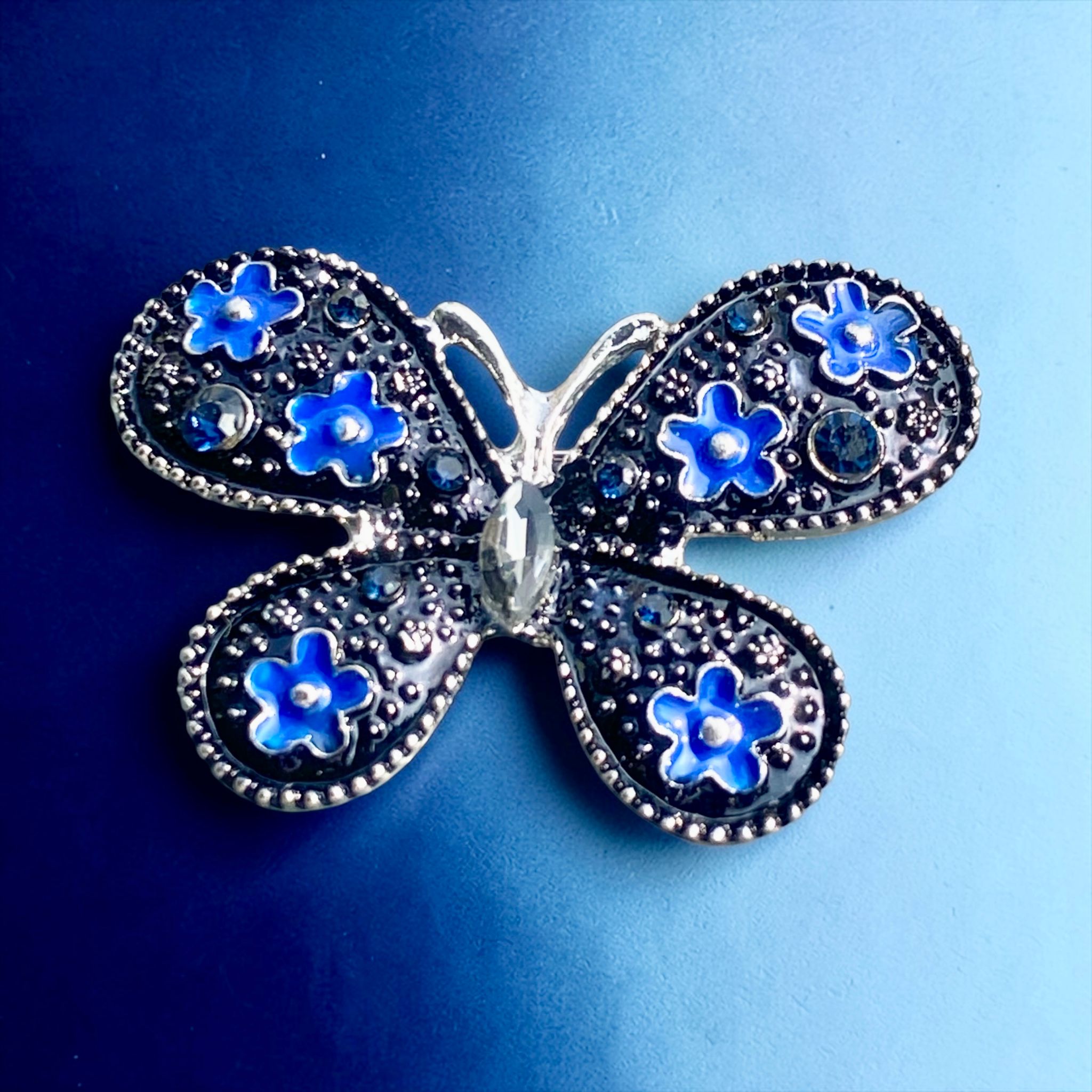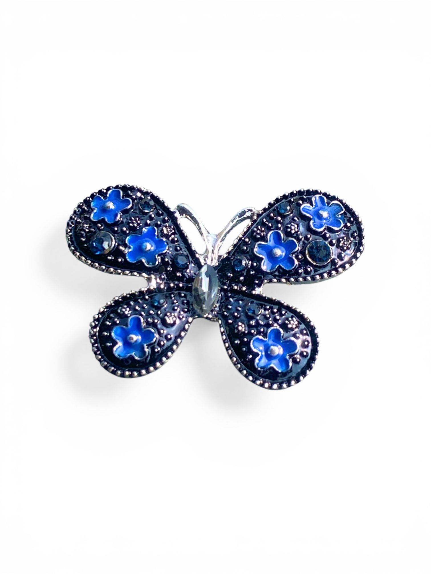 Siyah ve Mavi Mineli Gümüş Renk Kelebek Broş