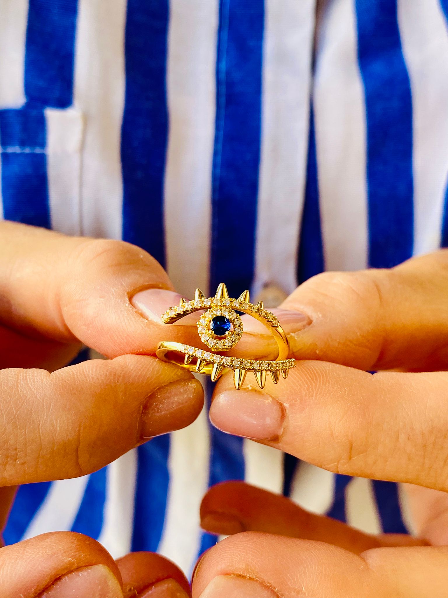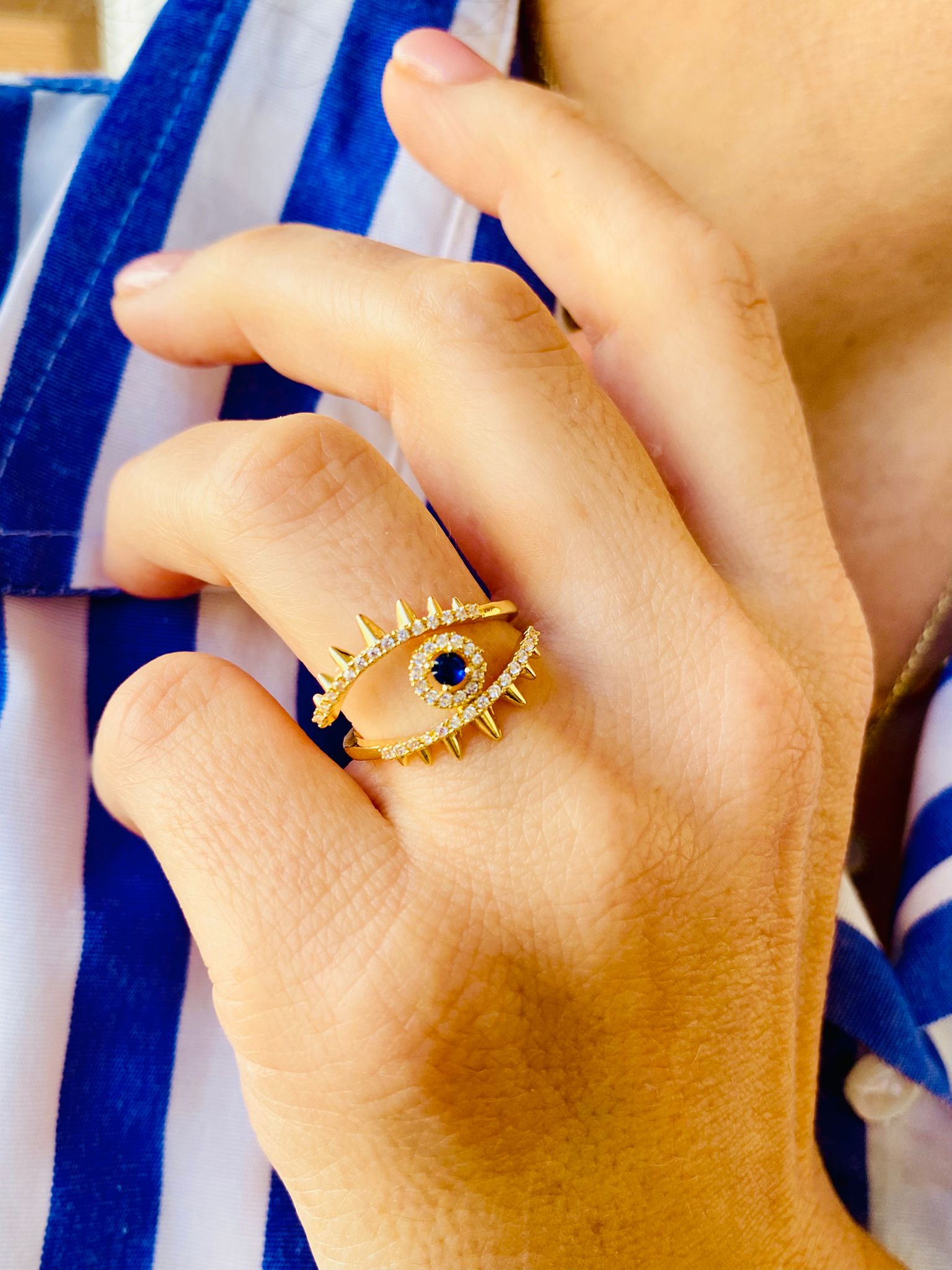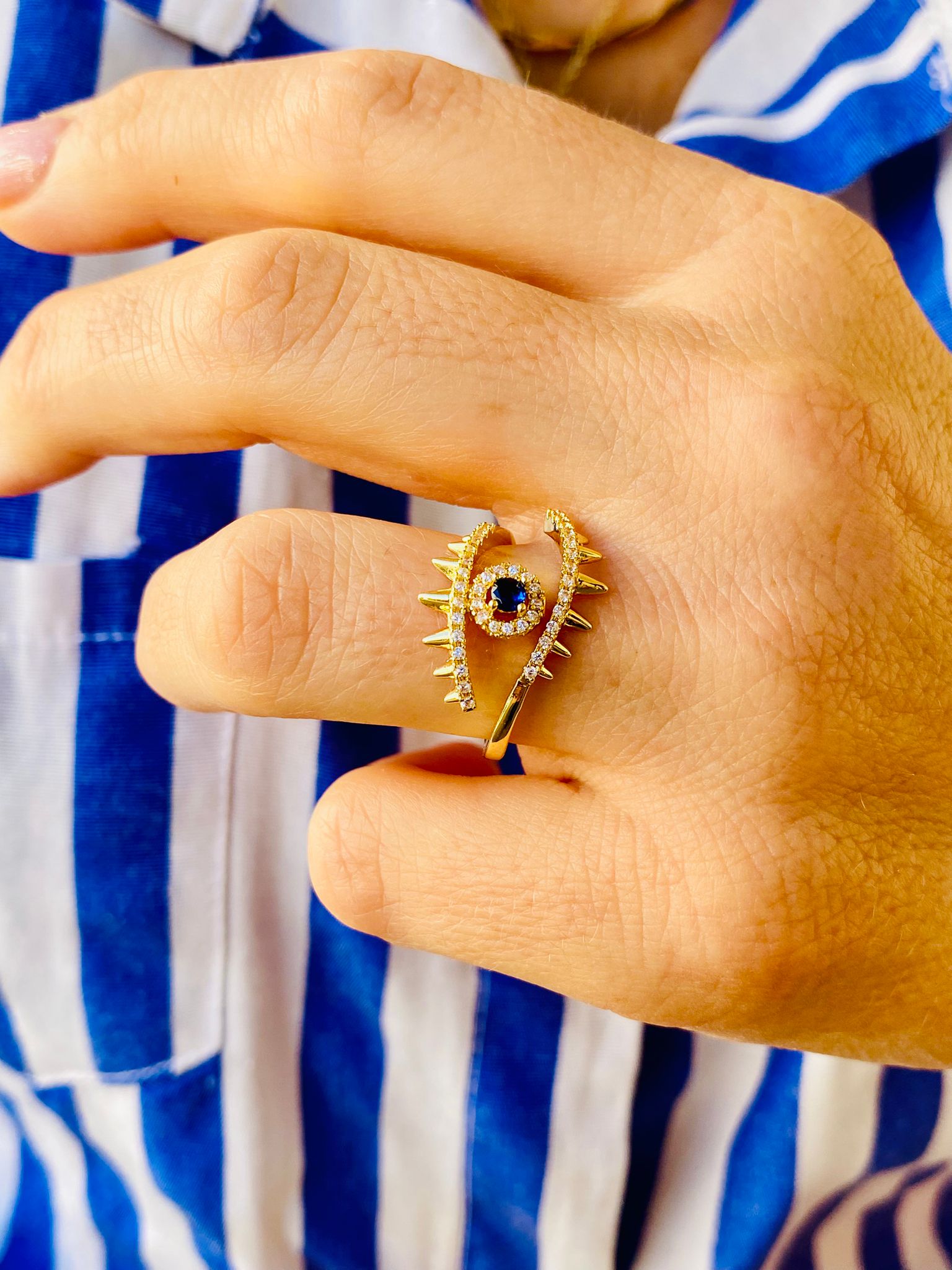 Zirkon Taşlı Altın Renk Safir Taşlı Göz Nazar Ayarlanabilir Yüzük