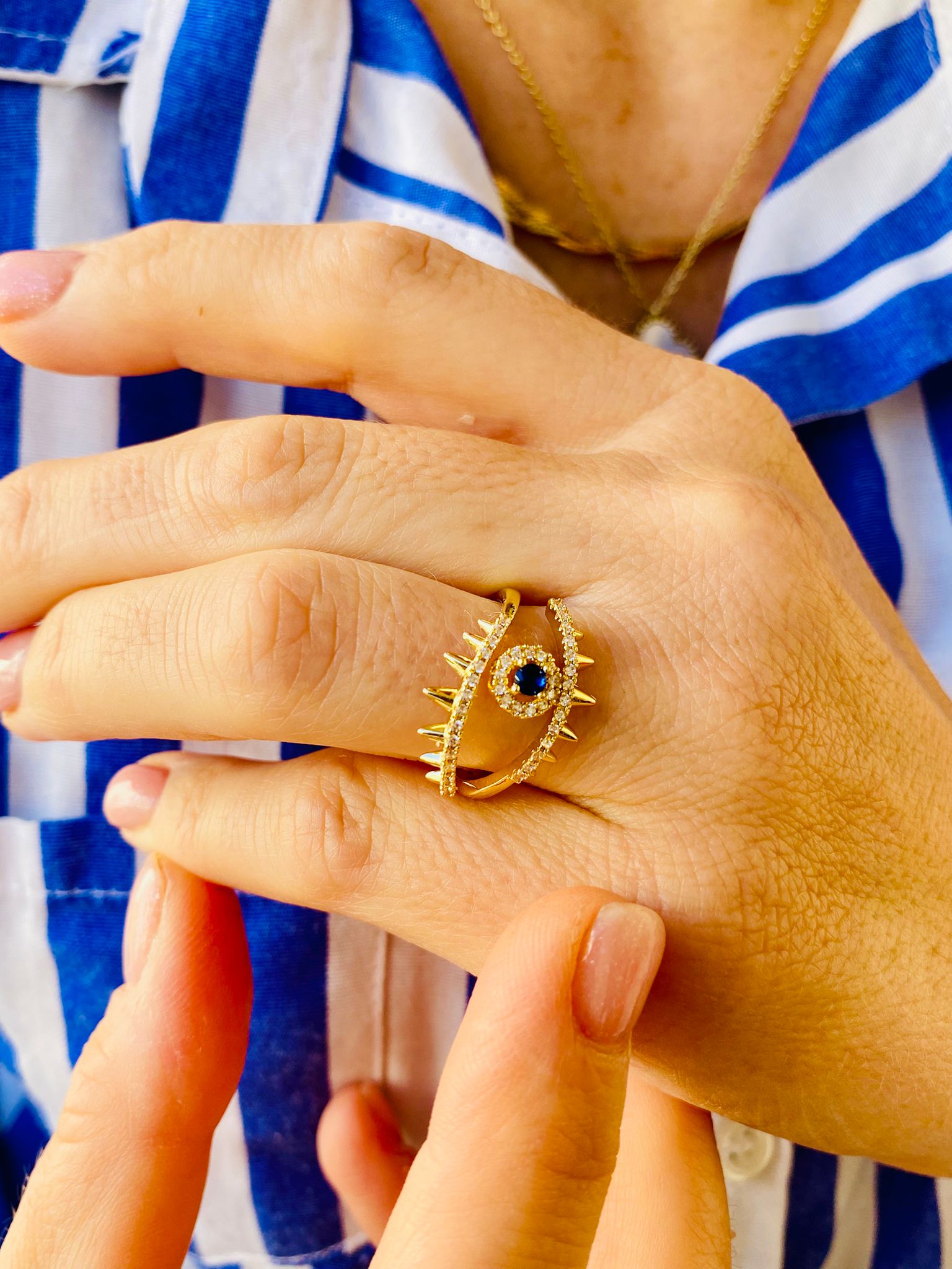 Zirkon Taşlı Altın Renk Safir Taşlı Göz Nazar Ayarlanabilir Yüzük, günlük hayatta rahatlıkla kullanılabileceği gibi özel etkinliklerde de göz alıcı bir detay olarak tercih edilebilir. Hem rahat klasik hem de şık gece kombinleriyle uyum sağlayacaktır. İster bir akşam yemeğinde, ister bir düğün töreninde bu yüzük, her ortamda dikkat çekmenizi sağlayacak.